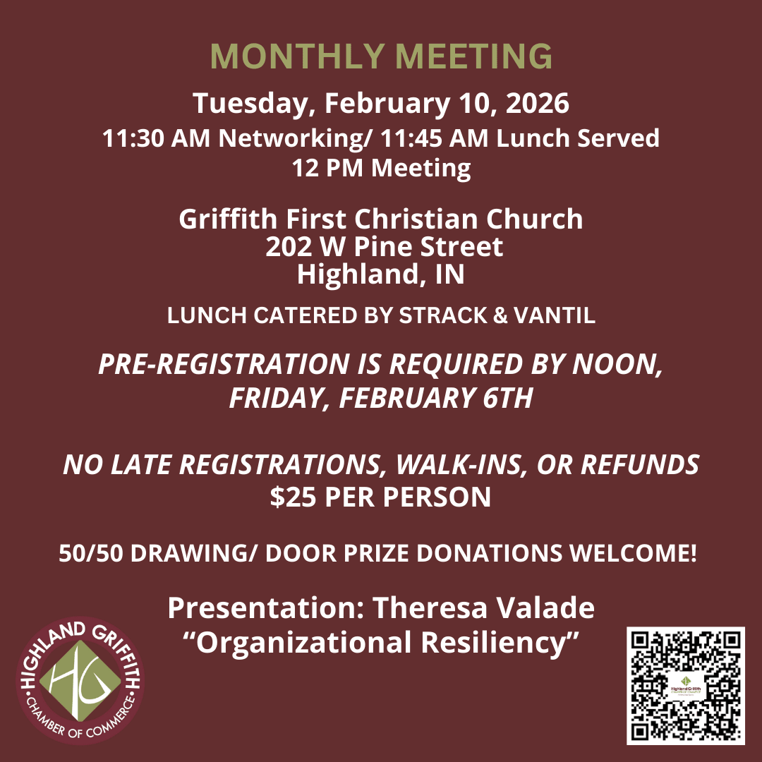 Join us for our February Membership Meeting at Griffith First Christian Church in Griffith. The meeting will feature a presentation by Theresa Valade, of Success Trek, on “Organizational Resiliency”. Lunch will be catered by Strack & VanTil. PURSUANT TO A NEW MEAL POLICY ADOPTED BEGINNING IN 2025: ADVANCE REGISTRATION IS REQUIRED BY NOON, FEBRUARY 6TH. NO LATE REGISTRATIONS OR WALK-INS WILL BE PERMITTED. NO REFUNDS WILL BE MADE IF YOU DO NOT ATTEND. IF YOU CHOOSE TO BE INVOICED, AN INVOICE WILL BE SENT TO YOU UPON REGISTERING FOR THE EVENT AND WILL BE OWED IF YOU DO NOT ATTEND. At the meeting, there will be a 50/50 drawing and a drawing for a free meal registration to be used at next month' meeting. Door Prizes are welcomed. Networking begins at 11:30 am/ Food served beginning at 11:45 am/ Meeting, reports and presentations begin at noon.