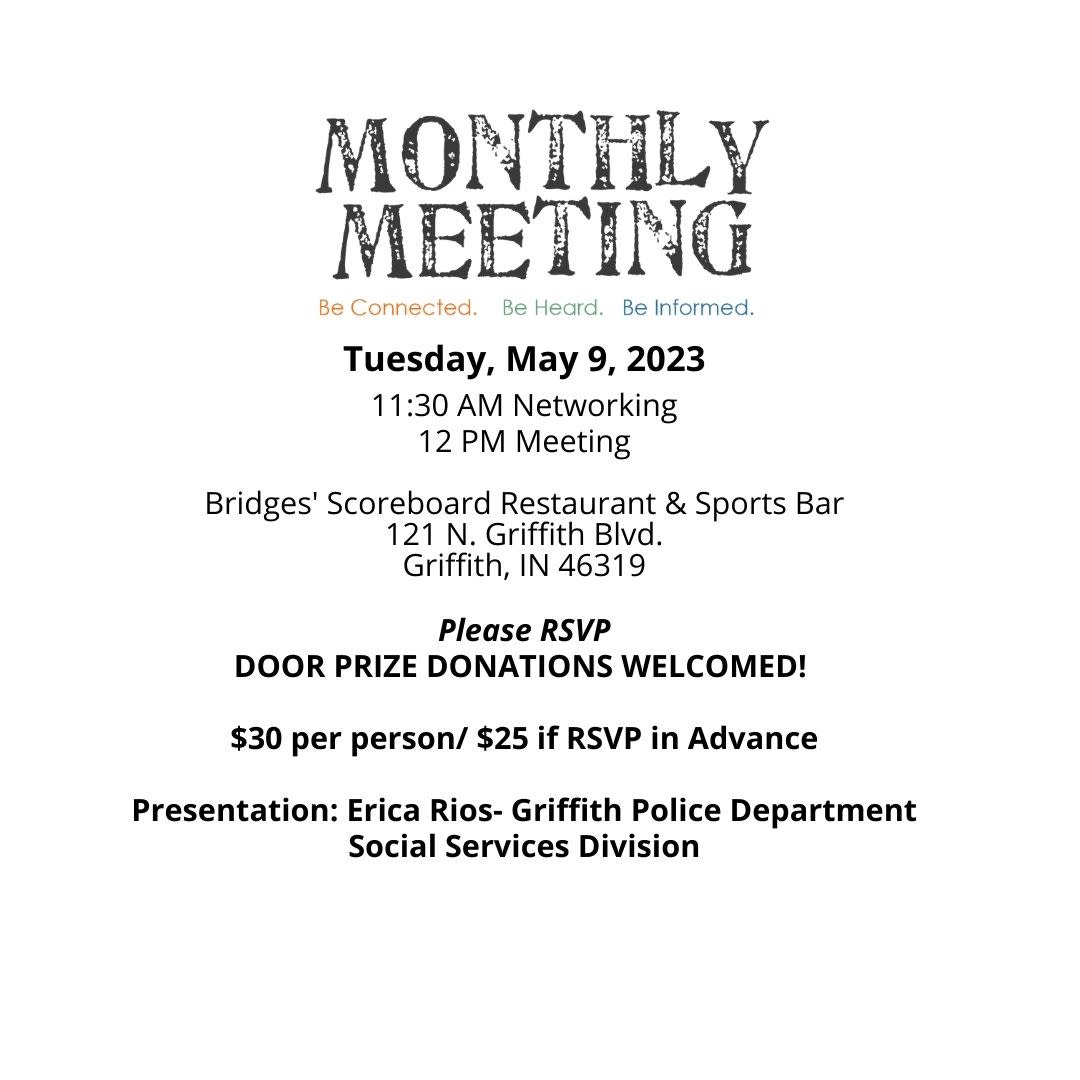 May monthly membership luncheon at Bridges' Scoreboard Restaurant & Sports Bar in Griffith- $30 per person, with a $5 discount for RSVP.