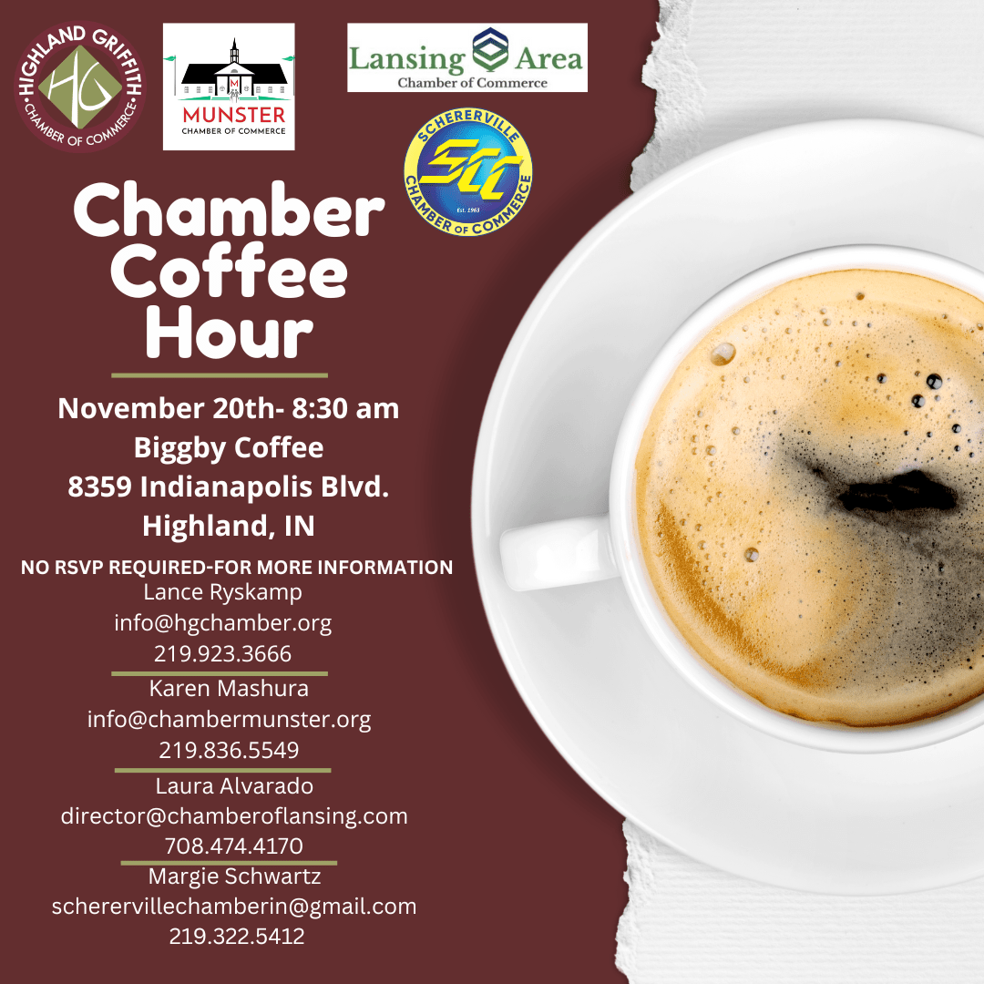 Join us for a morning networking hour hosted by the Highland/Griffith, Munster, Schererville, and Lansing Chambers. Members and non-Chamber members are welcome! Everyone gets 30-Second Introductions. No RSVP is Required for this FREE event! This month's event will be at Biggby Coffee, 8359 Indianapolis Blvd., in Highland.