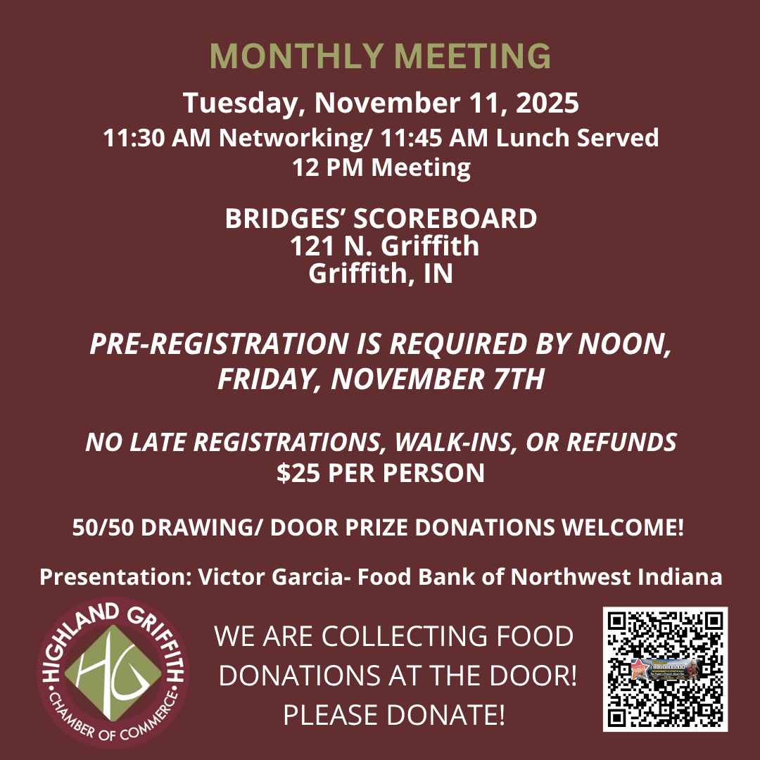 Join us for our November Membership Meeting at Bridges Scoreboard in Griffith. Our featured presentation will be by Victor Garcia, President/CEO of the Food Bank of Northwest Indiana. In the spirit of Thanksgiving, we are asking attendees to the luncheon to please bring a food donation for the Food Bank (see attachment). PURSUANT TO A NEW MEAL POLICY ADOPTED BEGINNING IN 2025: ADVANCE REGISTRATION IS REQUIRED BY NOON, NOVEMBER 7TH. NO LATE REGISTRATIONS OR WALK-INS WILL BE PERMITTED. NO REFUNDS WILL BE MADE IF YOU DO NOT ATTEND. IF YOU CHOOSE TO BE INVOICED, AN INVOICE WILL BE SENT TO YOU UPON REGISTERING FOR THE EVENT AND WILL BE OWED IF YOU DO NOT ATTEND. At the meeting, there will be a 50/50 drawing and a drawing for a free meal registration to be used at next month's meeting. Door Prizes are welcome. Networking begins at 11:30 am/ Food served beginning at 11:45 am/ Meeting, reports & presentations begin at noon. Thank you to our President's Gold Sponsors: